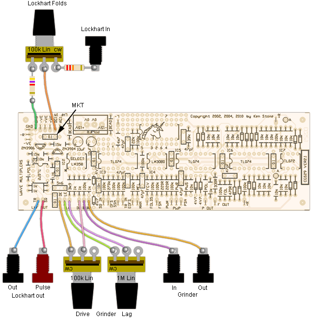 The 100n AC input capacitor on the Lockhart should be at a polyester type such as greencap or MKT. The remaining six 100n can be ceramic monoblock decoupling capacitors. ![]() Wiring the VER 2.0 PCB version of the Grinder and Lockhart folder.