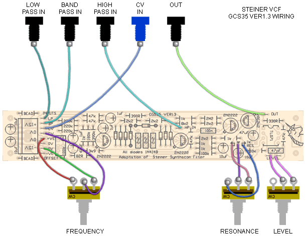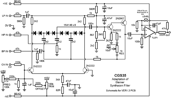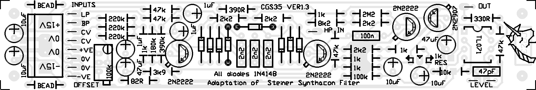The schematic of the Ver1.3 Synthacon VCF PCBs. The circuit uses a standard, non-inverting amplifier configuration. The three modes (HP, BP, LP) are obtained by injecting the signal into three different points of the circuit. An increase in the gain of the amplifier increases the filter's Q. The Q remains almost constant as the filter is swept across the audio spectrum. In the circuit, diode strings are used as voltage controlled resistors. The differential-amplifier transistors apply the bias voltage to the parallel diode string RC networks in opposing phase. The opposing phases cancel the control voltage so that none appears at the output. The final pair of transistors form a non-inverting amplifier. The variable resistor adjusts the gain of this amplifier, and thus its Q. The final stage is a simple gain stage, as I found the original was too quiet for my needs. In the first version of the PCB, this stage was inverting, while on the Rev 1 PCBS, this stage is non-inverting. The LEVEL pads are to allow for a level pot to be installed. Use a pot with a value of 50k or 100k (going even higher if needed, e.g. 250k), depending on the overall gain required. Alternatively, a fixed resistor could be put here, or even a link, if the 47k in series with it is increased to compensate. Note that the level pot does NOT allow the output to be reduced to zero, as this is impossible to do with a variable resistor in the feedback circuit of a non-inverting buffer. It will adjust the gain from the default 5:1 up to 15:1 assuming a 100k pot is used, effectively allowing you vary the output from standard to three times that level. (Based on an article by Nyle Steiner from Electronic Design 25, Dec 6th, 1974.) Construction