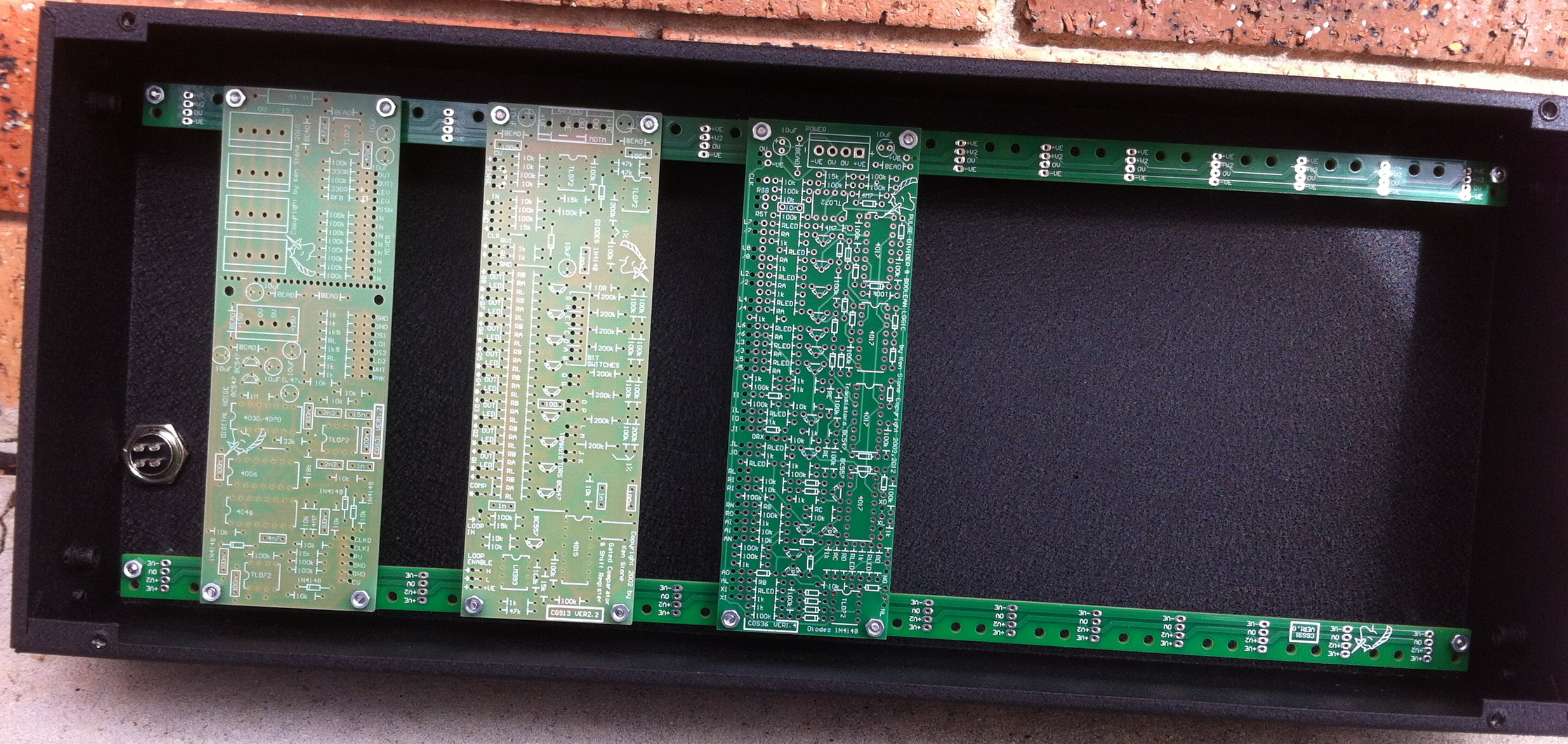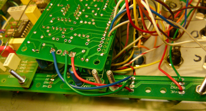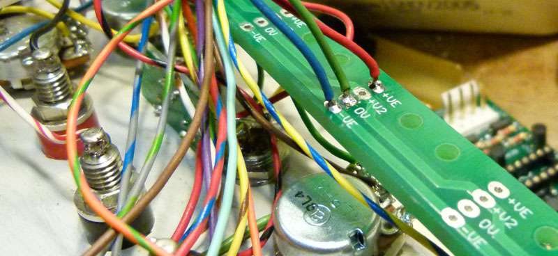 Each module on the panel is connected like this. The other ends of these wires to the rear of a module's onboard power connector. Power can now be fed to the whole panel through that board's power connector. Power connectors could be omitted from all but one PCB on the panel, although if installed, they are convenient for initial testing of the boards off-panel! Parts list