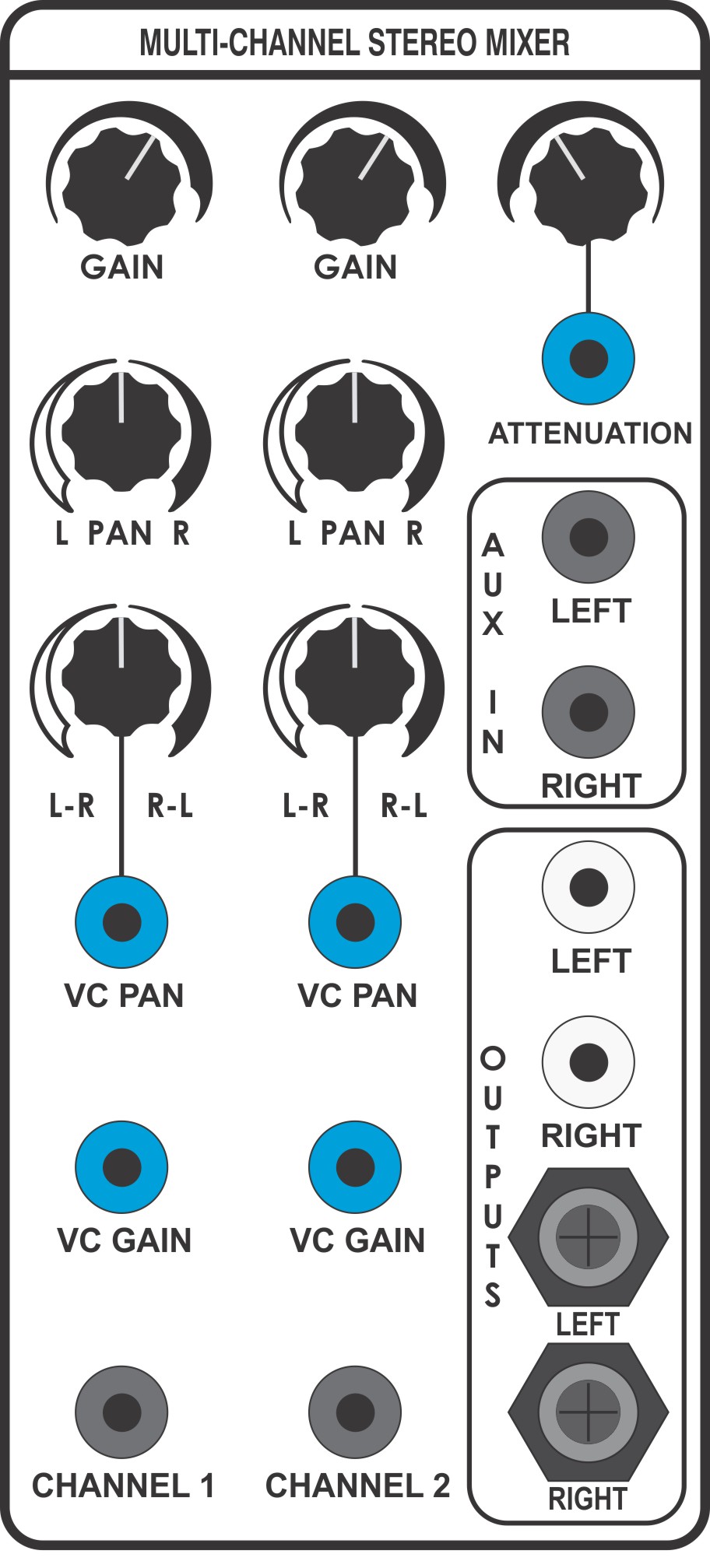 knobs or control voltages applied to the module. These are mainly useful for linking other mixers (either manual or voltage controlled)