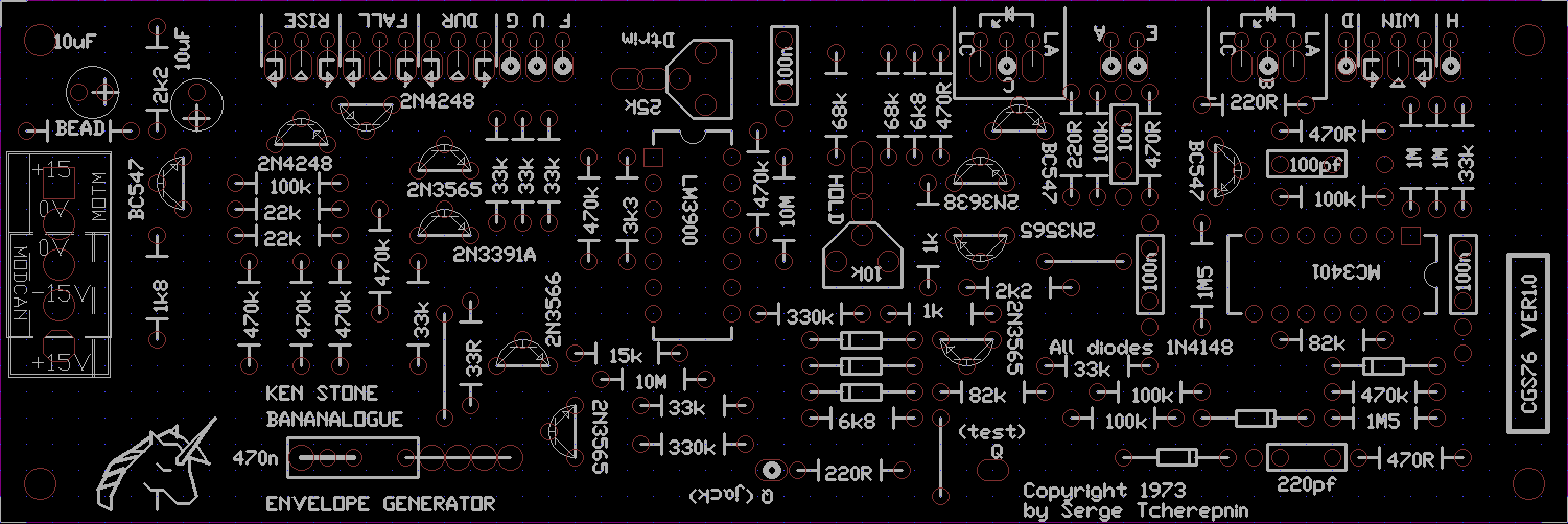 This is an adaptation of the original Serge Envelope Generator from the early "R" series PCBs. It has been produced under licence from Serge. This is NOT an ADSR style generator, and can be used as a voltage controlled LFO.