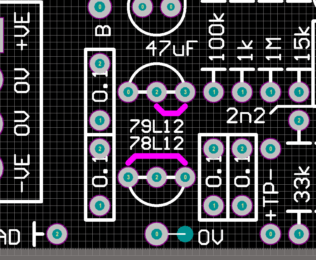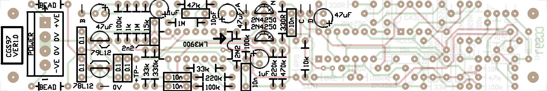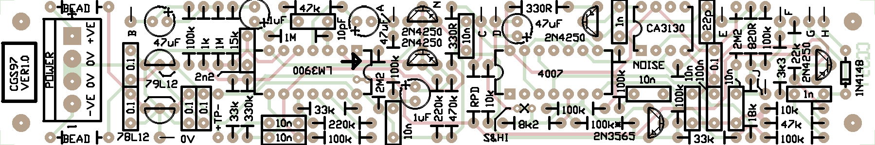 Set UpThe behavior of this circuit depends very much on the gain of the transistors used. It is possible if you have too much gain, the noise waveform will clip. A true RMS multimeter between 0V and output A (White Noise) will read between 1.3 volts and 1.69 volts if things are working correctly. Higher than 1.69 volts and clipping is likely. Lower than 1.3 volts, will merely mean you have a quieter/weaker output. The tricky part comes in setting up the S&H. Connect output E or F to a VCO, scaled so you can listen to the output range. Connect an LFO to input G. If you find the VCO frequently playing the same low note, you are sending the CA/LM3130 to it's upper limit. To deal with this, separate the circuits by cutting the short track between the two S&HI pads. The S&HI pads have an X between them on the overlay side to indicate where the cut should be made on the rear of the PCB. Connect the C output to the S&HI pad nearest pin 3 of the CD4007. You can then adjust the center voltage of the incoming waveform by installing the resistor "RPD". Notes: