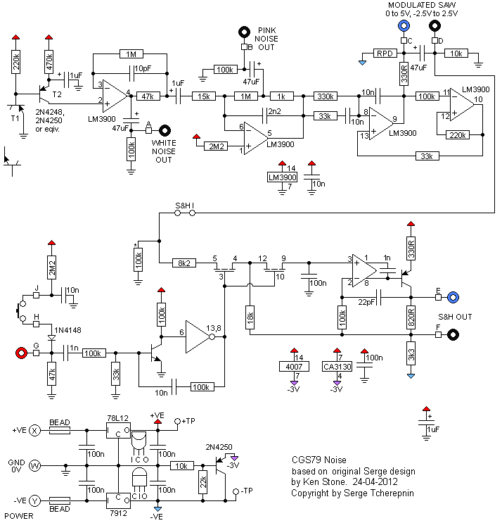 The Serge noise module can be built in several ways. In it's simplest form, it contains three basic outputs, White noise, Pink noise, and a random voltage suitable for use with Sample and Hold modules. An optional Sample and Hold circuit is included on the PCB. Alternatively, the basic version may be coupled with the CGS92 Serge Smooth and Stepped Generator to make the Random Voltage Generator module. It will work on either +/- 12 volts, or +/-15 volts by installing on-board regulators. A little on how it works: ![]() The schematic for the noise source. Construction![]()
