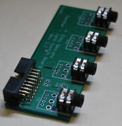 These boards can support any mix of up to 4 jacks and switches. The 2 pictures below show the boards dressed with 4 jacks and the other with 4 switches but any permutation of these is allowed. These PCBs are used when the associated front panel column has only jacks and/or switches.