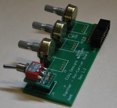 This board supports pots and, optionally, a mix of jacks and switches. When adding jacks or switches to this board they will (nearly) always be done by mounting them using the Panther Carrier Board. The picture shows this board with 3 pots and a switch. This PCB is used whenever the associated front panel column comprises a mix of pots, jacks and/or switches and requires the use of a Carrier PCB for each jack/switch to allow them to be aligned with the centre of the pots.