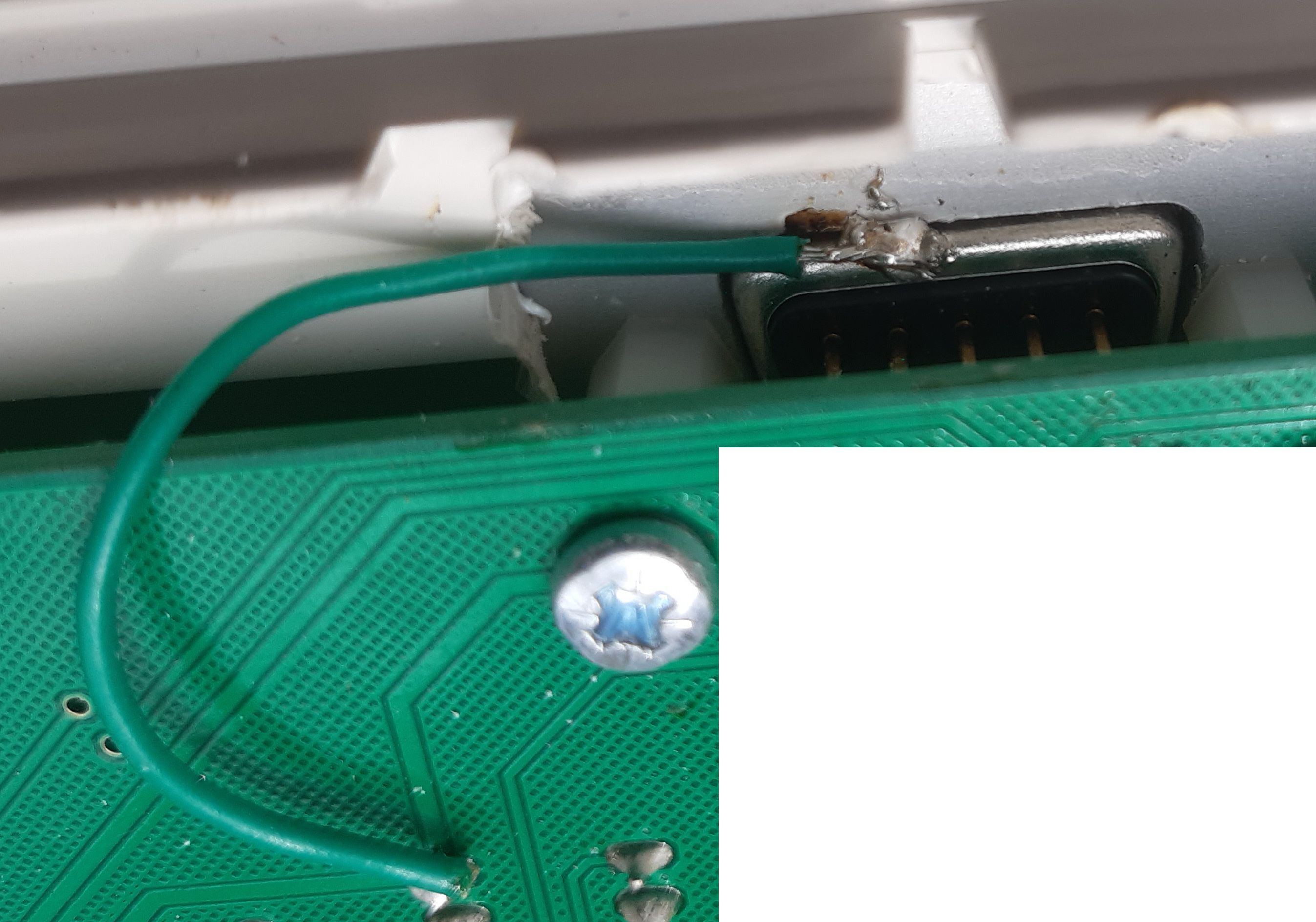 - Solder a 5cm piece of equipment wire to the underside of the DB9 as seen in the photo and solder the free end into the pad at bottom left of J1