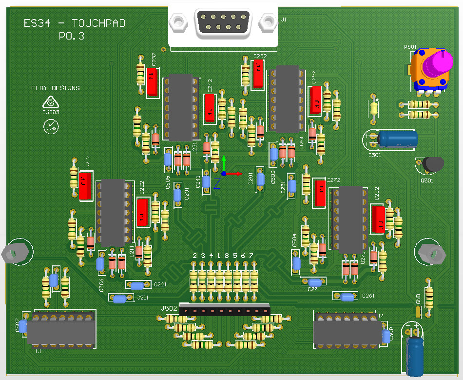 - Fit all components to the ES34 board except for the DB9 connector (J1). NB: If C501 and/or C509 are taller than 10mm then they should be laid flat against the PCB