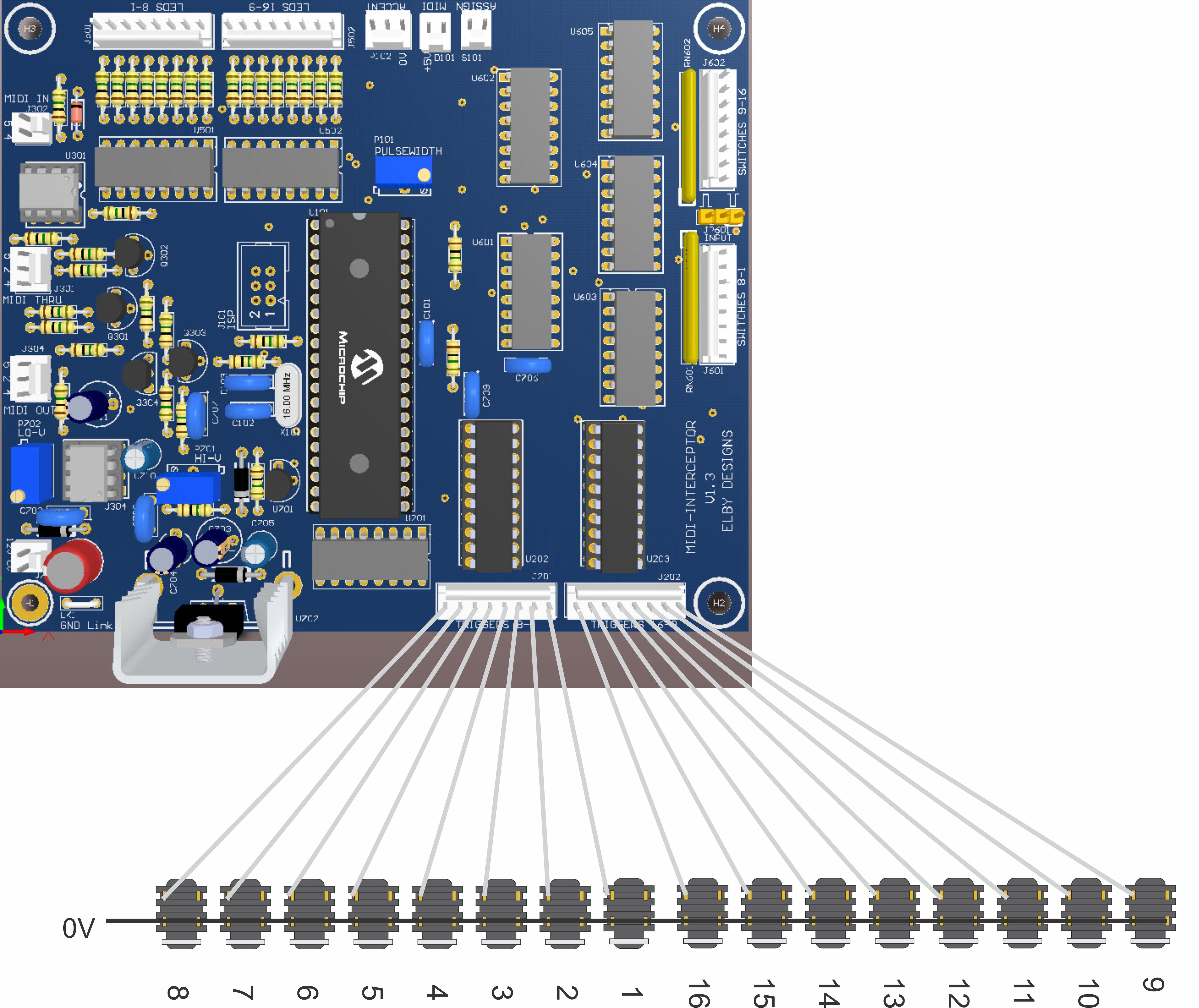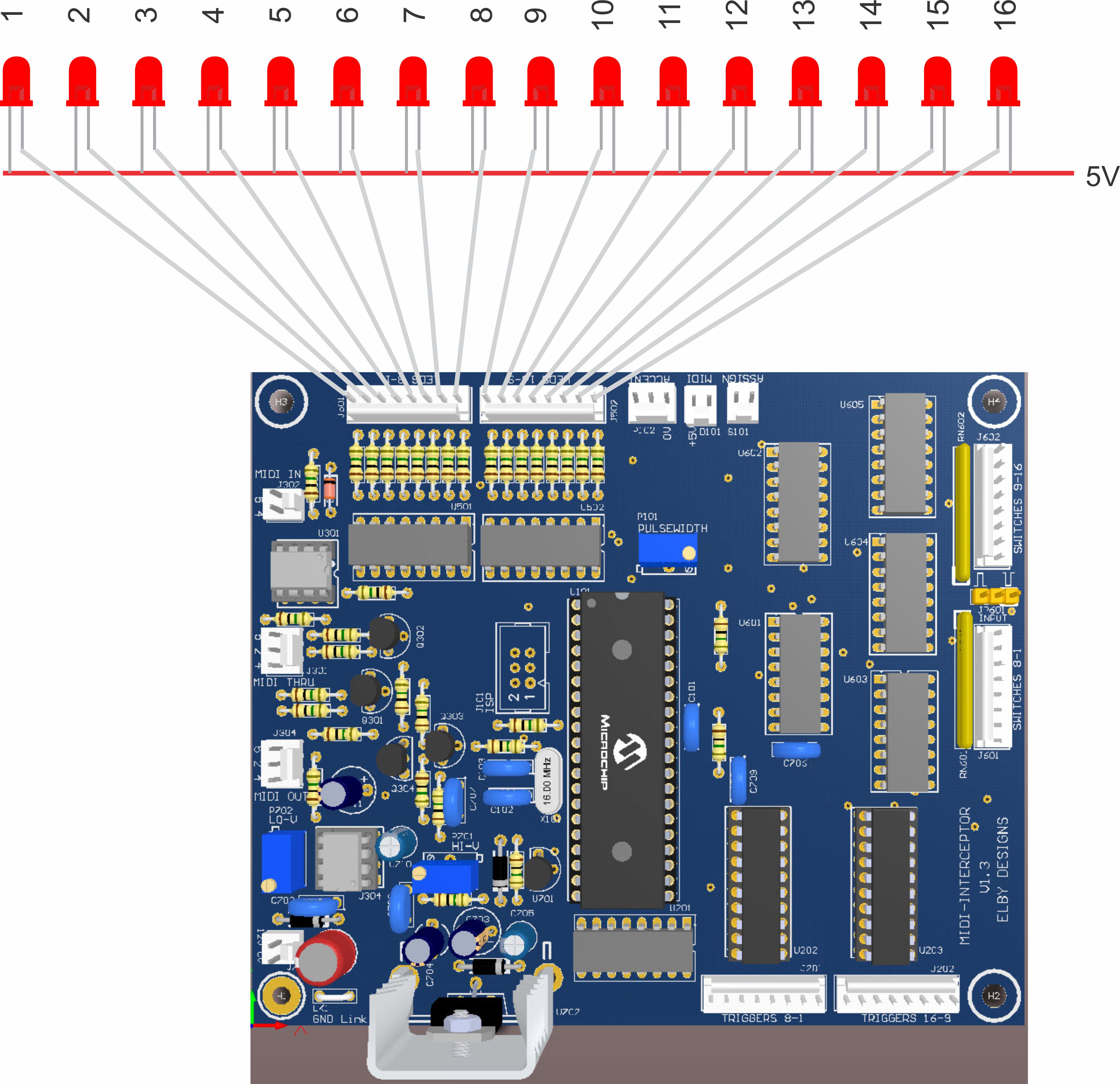 A MIDI LED can be connected to D101 and indicates the receipt of valid MIDI messages.