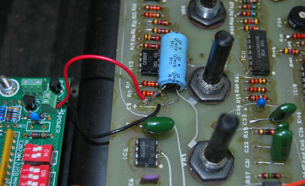 Feed the power wires from J301 to a suitable location on the WASP PCB (we recommend using the large power supply filter capacitor C8 at the top centre edge of the WASP PCB - our picture shows the wires terminated to the capacitor legs on the topside of the PCB but you may need to attch the wires to the underside of the PCB