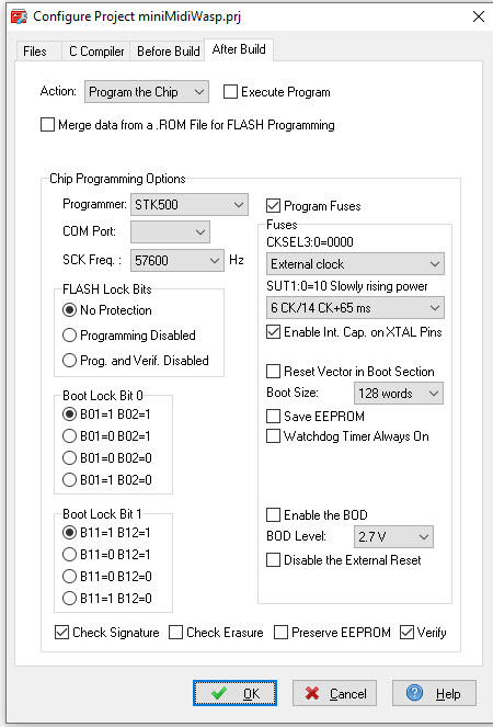 | If using the HEX/EEP files provided then you shoudl check that the various Programming Options are set according to the image to the right |