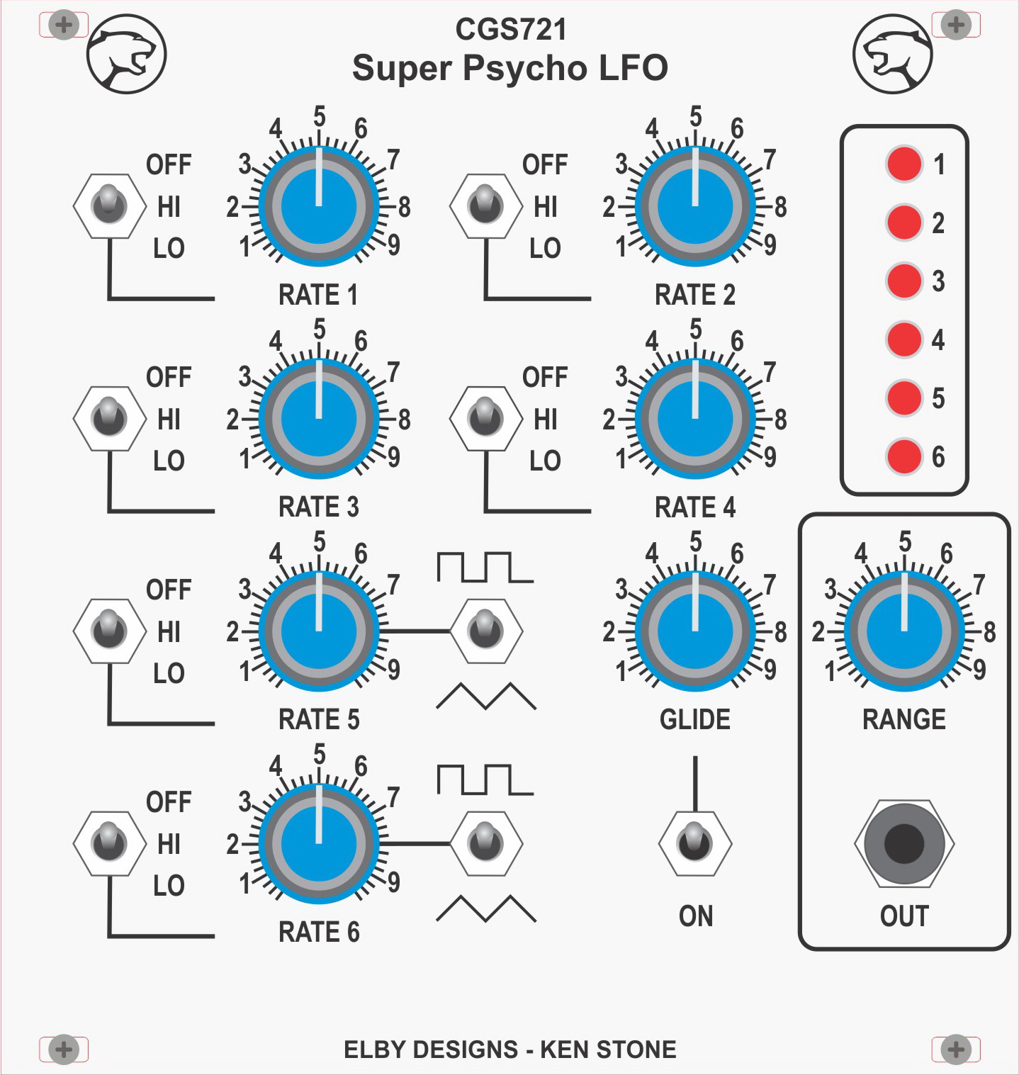 The CGS721 is a much expanded version of the Psycho LFO, featuring six free-running oscillators, each variable between LFO and audio ranges, two of which can be switched to have triangular wave outputs. Each oscillator can be switched between low and high ranges, as well as off, and also has a rate LED, to allow visual determination of the frequency at which it is running. As per the original, there are also level and glide controls.