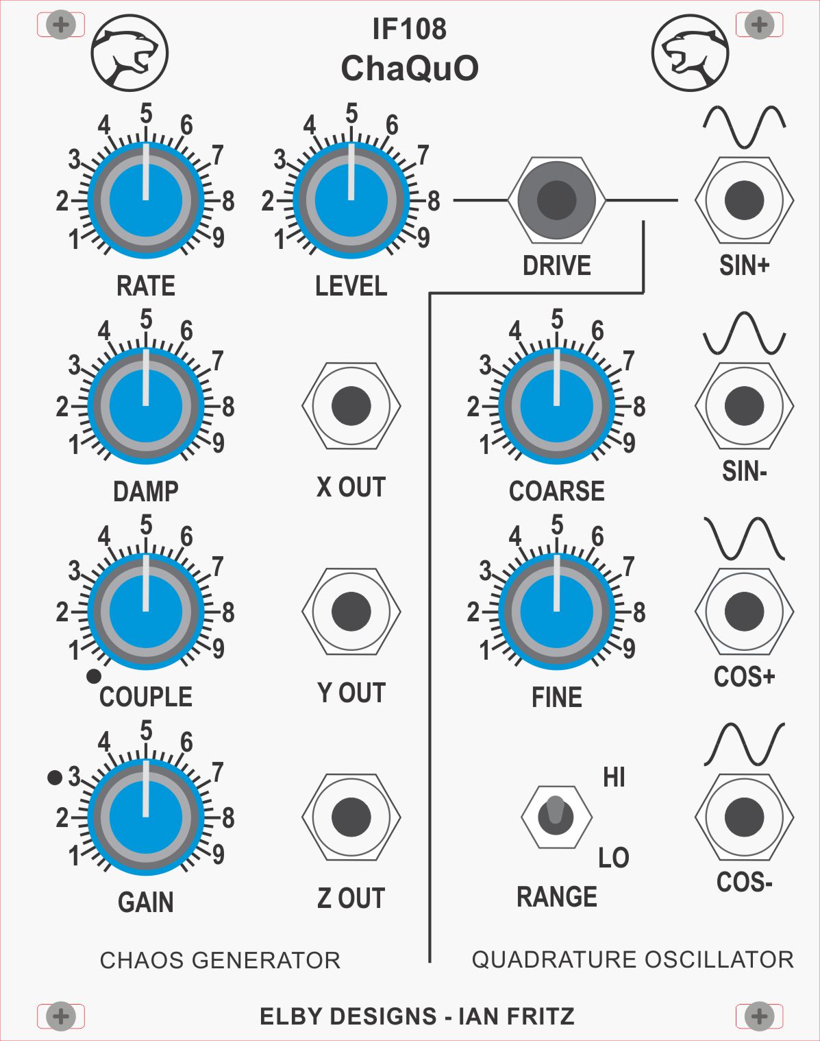 The IF108 is a combination module combining a Chaos Generator ('Cha') with a manually driven Quadrature Oscillator ('QuO').
