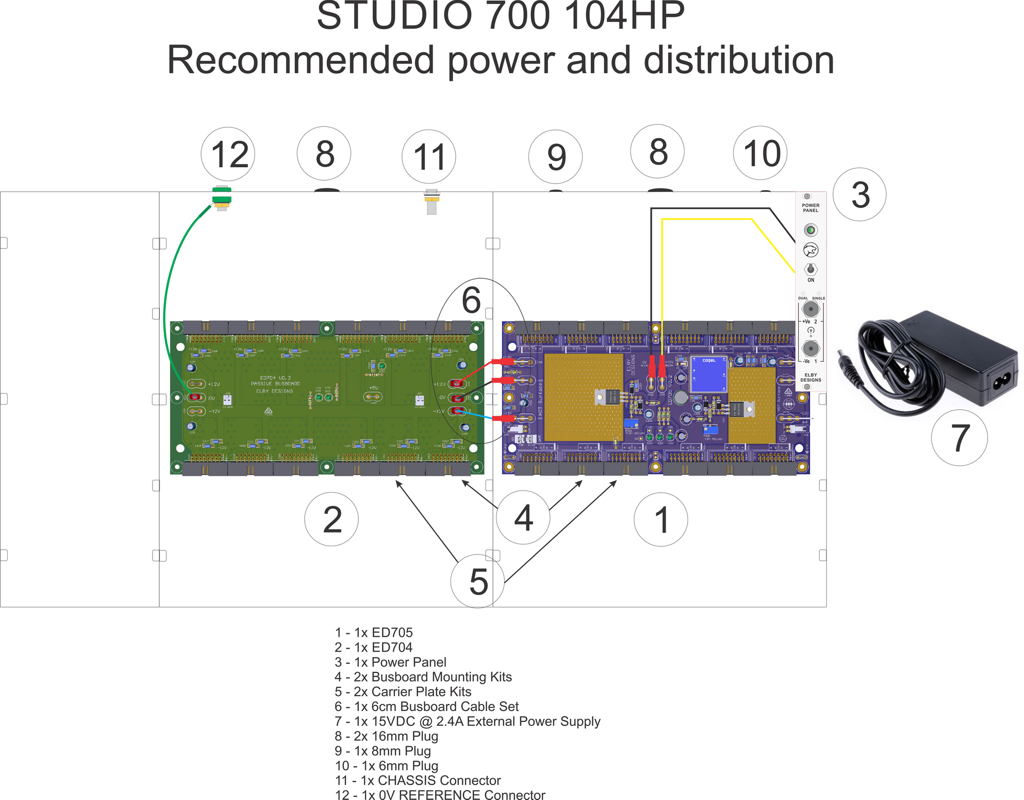 (*) The indicated number of busboards (both powered and passive) is the recommended minimum configuration offering good power capacity and plenty of, and easily accessible, module power outlets. Passive busboards may be replaced with powered busboards if extra power is required (the number of module outlets does not change). So, for example, the Studio 700 84HP could have 2x ED705 giving a load capacity of +12V @ 3A and -12V @ 2A with 24 module outlets. Each boat is fitted with a 4HP Power Panel which allows the external 15VDC supply to be quickly and easily connected and disconnected. The 4HP Power Panel also includes 'Power In' status indication and an ON/OFF switch. Having the external power connection on the front panel also means that during transport there are no external parts that can get knocked or damaged and makes loading the case into a tight space easier. The available module space is thus:-